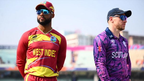 আগে ব্যাটিং করে ওয়েস্ট ইন্ডিজ ১৮২ রান সংগ্রহ করে। কঠিন লক্ষ্যে খেলতে নেমে ১৫ ওভার পর্যন্ত মোটামুটি ভালো অবস্থানেই ছিলো স্কটল্যান্ড। তবে ১৭ ওভারেই চিত্রনাট্য বদলে যায়।