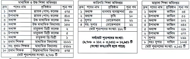 পূর্বের বিজ্ঞপ্তি অনুযায়ী, মাধ্যমিক ও উচ্চশিক্ষা অধিদপ্তরের (মাউশি) আওতাভুক্ত শিক্ষাপ্রতিষ্ঠানে শূন্য পদ ছিল ১০ হাজার ২৭৮টি। কারিগরি শিক্ষা অধিদপ্তরের আওতায় শূন্য পদ ১৯০টি এবং মাদ্রাসা শিক্ষা অধিদপ্তরের আওতায় শূন্য পদ ছিল ৩ হাজার ১৩১টি। তিন অধিদপ্তরের সর্বমোট শূন্য পদের সংখ্যা ছিল ১৩ হাজার ৫৯৯।