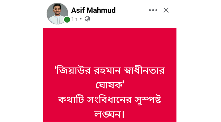 আসিফ মাহমুদ লিখেছেন, ‘জিয়াউর রহমান স্বাধীনতার ঘোষক’ কথাটি সংবিধানের সুস্পষ্ট লঙ্ঘন।