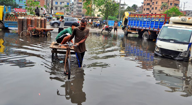 সোমবার (২৭ এপ্রিল) সরেজমিনে গিয়ে দেখা যায়, আগের দিনের বৃষ্টির পানি জমে জলাবদ্ধতা তৈরি হয়েছে। এতে চায়ের দোকান থেকে শুরু করে স্কুল, মাদরাসা ও হাসপাতালের সামনে দুর্ভোগের শেষ নেই।