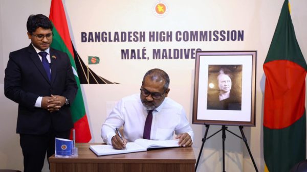 বিএনপি চেয়ারপারসন ও সাবেক প্রধানমন্ত্রী খালেদা জিয়াকে শ্রদ্ধাকে জানাতে মালদ্বীপে অবস্থিত বাংলাদেশ হাইকমিশনে খোলা শোকবইয়ে স্বাক্ষর করেছেন মালদ্বীপের পররাষ্ট্রমন্ত্রী ড. আব্দুল্লাহ খলিল। সোমবার (৫ জানুয়ারি) মালদ্বীপের পররাষ্ট্র মন্ত্রণালয় এ তথ্য জানিয়েছে। মালদ্বীপের পররাষ্ট্র মন্ত্রণালয় জানায়, মালদ্বীপে অবস্থিত বাংলাদেশ হাইকমিশন পরিদর্শন করেন মালদ্বীপের পররাষ্ট্রমন্ত্রী ড. আব্দুল্লাহ খলিল। হাইকমিশনে সাবেক প্রধানমন্ত্রী খালেদা