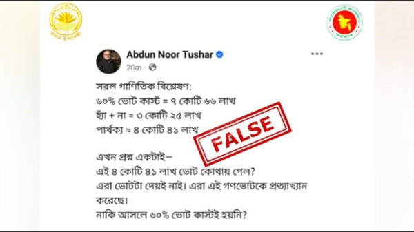 গণভোট নিয়ে অনলাইন অ্যাকটিভিস্ট আব্দুন নূর তুষারের দেওয়া একটি পোস্ট ফেসবুকে ভাইরাল হয়েছে। শুক্রবার (১৩ ফেব্রুয়ারি) রাতে নিজের ফেসবুক আইডিতে দেওয়া ওই পোস্টে আব্দুন নূর তুষার দাবি করেন, “গণভোটে ‘হ্যাঁ’ এবং ‘না’ মিলে মোট ৩ কোটি ২৫ লাখ ভোট পড়েছে। অন্যদিকে নির্বাচনে ভোট দিয়েছে ৭ কোটি ৬৬ লাখ মানুষ। তিনি
